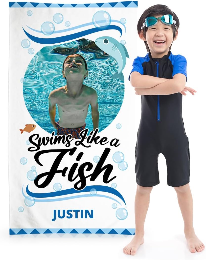 Make your child’s beach or pool day even more special with our Customizable Kids' Beach Towels. These vibrant and fun towels can be personalized with your child's favorite photo and their name, creating a unique and memorable accessory they will love. Choose from three exciting themes: "Swims Like a Fish," "Fun in the Sun," and "Coast Guard Junior Trainee," each designed to add a touch of fun to your child’s swim time. Crafted with care, the front side of the towel is made of 100% Polyester, offering a super soft silk touch, while the back is made of 100% Cotton Terry, ensuring maximum absorbency to dry off quickly. Measuring 30”x60”, these towels are perfectly sized for kids, lightweight, and easy to carry. They are also incredibly durable, breathable, and machine washable. Simply toss them in the wash and tumble dry on low to keep them looking vibrant and feeling soft. Whether it’s a day at the beach, a trip to the pool, or bath time at home, these customizable kids' towels are the perfect choice for adding a personal touch to your child’s routine. They also make fantastic gifts for birthdays, holidays, or any special occasion. To create your customized towel follow these directions: 1. Click the Customize Now button 2. Click the Browse button to locate the image you would like to use 3. Use the customization tool to resize, move and/or rotate your image 4. Enter name or text (optional), choose font and text color 5. Once you are satisfied, click the Buy Now button and check out. For print quality, upload a photo with minimum original photo dimensions of 2000 x 1600 (approximately 3 MB). We will not accept returns for image quality issues. Printing is only on one side of the beach towel. The other side will be solid white in color. Note: These are customized beach towels, and therefore are not available for return, except for material quality issues only.